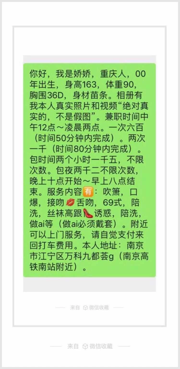 信息分类:楼凤兼职 地区:江苏省-南京 信息来源:已经开发 小姐数量:1 小姐年龄:20 小姐素质: 85 小姐外形:90 服务项目:全套 营业时间:中午12点到凌晨2点 环境设备:80 安全评估:不去安全 详细地址:本段信息已隐藏,请先登陆。点击登陆 , 或者 点击注册 联系方式(手机号/QQ/微信):本段信息已隐藏,请先登陆。点击登陆 , 或者 点击注册 综合评价:90 详细介绍: 不擅长写小黄文,去就完事了。 楼凤兼职