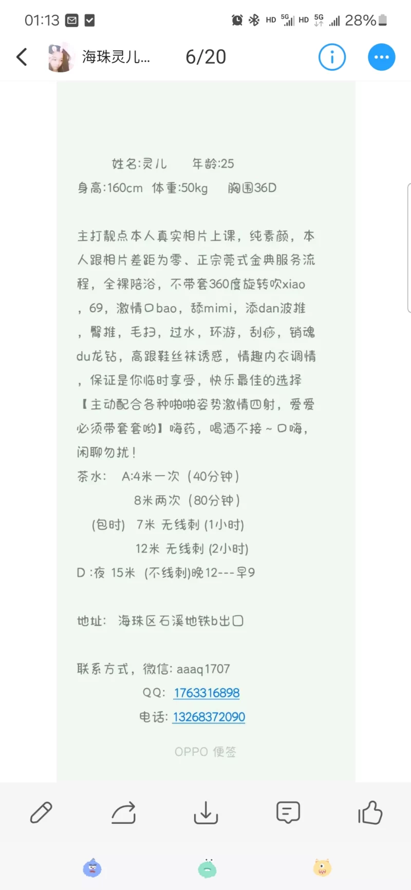 信息分类:楼凤兼职 地区:广东省-广州 信息来源:狼友分享 年龄:25 颜值身材:8 服务项目:全套 价格:400-1500 环境设备:公寓 详细地址:本段信息已隐藏,请先登陆。点击登陆 , 或者 点击注册 联系方式(QQ号):本段信息已隐藏,请先登陆。点击登陆 , 或者 点击注册 详细介绍: 个人真实体验过,照片本人基本零差距 楼凤兼职